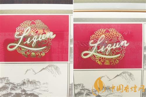商標(biāo)紙印刷工藝差異對(duì)比:真煙“Liqun”字母以及花球的圖案清晰,線條清晰飽滿,立體感較強(qiáng)。假煙圖案整體較為模糊,字體不飽滿,邊緣不清晰,無(wú)立體感。
