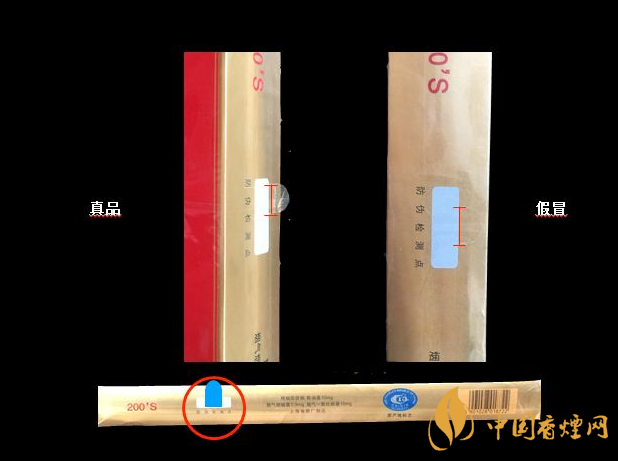 通過觀察條盒或小盒的紅色底紋來區(qū)別油墨的不同(拆開透明紙更明顯些),真品卷煙紅色底紋采用了植絨油墨進行印刷,在自然光下呈現(xiàn)啞光紅色,用手觸摸有絲絨感;而假冒卷煙的紅的油墨多呈現(xiàn)反光,并且用手去摸和普通的印刷品一致。
