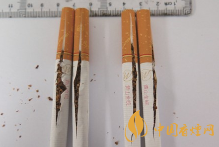 煙絲結(jié)構(gòu)差異對(duì)比:真品煙絲顏色呈現(xiàn)出金黃色,葉絲配比多,油潤性好,含煙末少,切絲寬窄均勻一致;假煙煙絲劣質(zhì),葉絲配比少,煙絲摻雜質(zhì)多,煙梗大、煙末多,與真品煙絲結(jié)構(gòu)存在明顯差異。