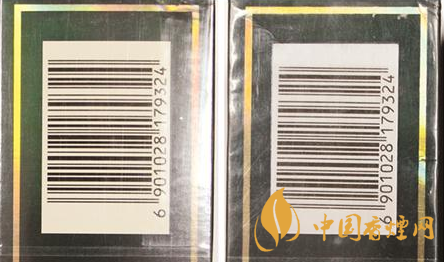 煙用包裝膜材質(zhì)及條形碼對比:真品卷煙條包裝膜材質(zhì)光滑,均勻無皺褶,條形碼區(qū)域呈淡黃色,套色均勻清楚。假煙條包裝膜材質(zhì)粗糙,有不均勻皺褶,條形碼區(qū)域為白色,套色邊緣放大后模糊不清。