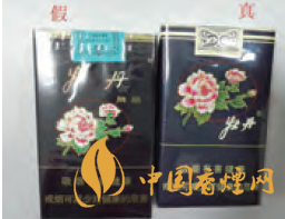 正面商標(biāo)紙差異對比:真品卷煙采用絨面印刷工藝,花形悉心勾勒,更顯質(zhì)感,圖案“牡丹花”更為寫實。假冒偽劣“牡丹(軟藍)”多以舊版“牡丹花”造型進行模仿,其圖案與真品存在明顯差異。