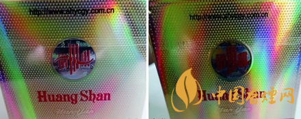 商標(biāo)紙定位燙金工藝差異對比:真品小盒背面定位燙金,其成像效果字體及圖案清晰完整,且邊緣無明顯脫漆掉色;假煙仿造技術(shù)粗糙,特別是燙金圖案內(nèi)的黃山及“Huangshan”拼音字體無法完整呈現(xiàn)出來,與真品燙金工藝存在明顯差異。