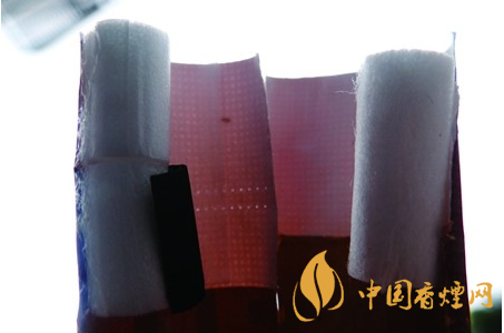 煙支濾嘴棒及降焦打孔差異比對:真品煙支濾嘴棒采用新型降焦“二元復合炭紙過濾嘴棒”,長度24(12+12)mm兩段式組合,接裝紙上有兩排降焦打孔;假煙濾嘴棒采用單一丙纖材質(zhì)的濾嘴,長度只有19mm,接裝紙上無任何打孔,無法達到物理降焦效果,與真品工藝特征存在明顯差異。