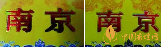 小盒商標紙印刷工藝差異比對:真品卷煙小盒商標紙“南京”字體印刷由無數(shù)個相等小圓點組合而成且立體感強,印刷工藝水平技術(shù)含量高,不易被仿制印刷;假煙小盒商標紙“南京”字體采用普通仿制套印燙金工藝,字體沒有立體感和線條層次感,套印燙金工藝粗糙且邊緣有毛渣,與真品印刷工藝差異明顯。