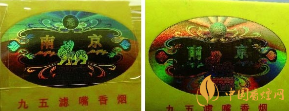 小盒頂部鐳射燙印防偽標識差異比對:真品卷煙小盒頂部鐳射燙印防偽標識圖案中幾個切換亮點,南京、辟邪和二龍戲珠組合,切換不同角度時,幾組鐳射燙印會呈現(xiàn)出不同防偽效果圖案,二龍戲珠里暗藏有重疊“九五香煙”四個字,切換角度時,幾個字能自由切換出來,鐳射燙金仿制難度極高;假煙小盒頂部鐳射燙印防偽標采用“掃描照相”等仿制技術(shù),套色燙金嚴重失真,特別是二龍戲珠暗藏的“九五香煙”四個字模糊不清無法呈現(xiàn)出來,與真品鐳射燙印防偽標識差異明顯。