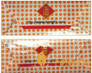 2.小盒拉帶線材質(zhì)及防偽技術(shù)差異對比:真煙的拉帶線為不干膠專用拉帶線,在紫外熒光燈的照射下會顯示紅色字母圖案,在正常光線下變換不同角度觀察時(shí)會變換出紫紅色;假煙的拉帶線均為普通拉帶線,生產(chǎn)工藝粗糙,不具備真煙拉帶線所呈現(xiàn)出來的特征及效果。