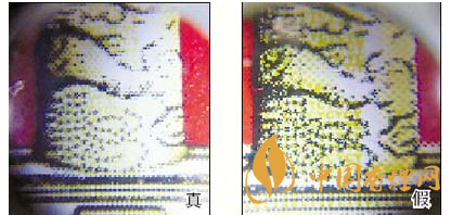 3.小盒背面華表底座微縮印刷工藝差異對(duì)比:真煙微縮防偽印刷圖案效果呈現(xiàn)主次分明、清晰度高、套印準(zhǔn)確的特點(diǎn);假煙采用照相或掃描的方法仿制,字體及圖案變形增大,無(wú)主次感,微縮字體及圖案比較粗糙,呈現(xiàn)出來(lái)的效果是模糊不清的。