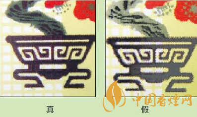 3.看“花盆”圖案:真品卷煙的花盆為咖啡色,花盆底層的網(wǎng)格狀紋路隱約可見;假冒卷煙的花盆大多為黑色,顏色較深,看不到花盆底層的網(wǎng)格狀紋路。