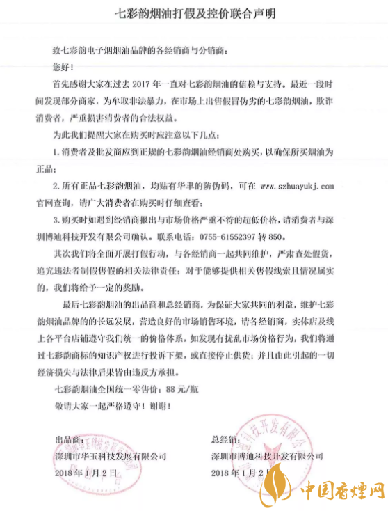 經(jīng)確實了云南中煙七彩韻真假事件后,為維護七彩韻品牌的良好聲譽,也為了維護喜愛七彩韻煙油的消費者權(quán)益,現(xiàn)與總經(jīng)銷——深圳博迪科技開發(fā)有限公司共同發(fā)布以下聯(lián)合聲明: